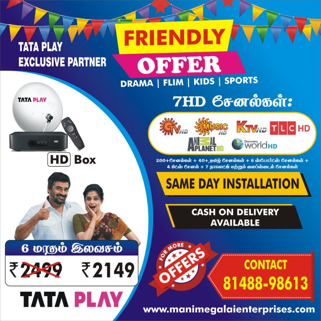 Manimegalai Enterprises call 8148898613 to provide a Tata play new DTH Connection all over Chennai, especially in Kottivakkam, Neelankarai, Thiruvanmiyur, Palavakkam, Anna Salai, Adyar, Besant Nagar, KK Nagar West, Kodungaiyur, Kolathur, Pondy Bazaar, Poonamalle, Madipakkam, Velacherry, , Puzhuthivakkam, Meenambakkam, Tirisulam, Tambaram, Tambaram Sanitorium, Pazhavanthangal, ST. Thomas Mount, Guindy, Kodambakkam, Chetpet, Ayanavaram, Purasaivakkam, Royapettah, Royapuram, Tiruvetriyur, Medavakkam, Ambattur, Mugappeir West, Triplicane, Nungambakkam, Koyambedu. Tata Play HD Connection Madipakkam & Tata Play SD New Connection in Madipakkam, Such a best DTH service provider by manimegalai Enterprises – 8148898613 & for more details https://manimegalaienterprises.com/Tata play best of Entertainment, Movies, Knowledge, and Lifestyle. Enjoy access to these pre-defined customized packages from the leading DTH service provider of Madipakkam. Tata Play Madipakkam which provides the best customer care support is on the city side. The success of Enterprises depends on its ability to precisely capture and efficiently provide new connections & Packages available as per Customer’s needs. 10m Cable-free, 1year warranty, and free installation within 3 hours. This advertisement explains in detail the features and benefits of TATA Play over several other DTH providers that are available in Madipakkam Chennai. The smartest thing about Tata Play DTH service Madipakkam Chennai gives very good customer service, however, there are declarations against this kind of phttps://manimegalaienterprises.com/romise all over the net. As we explained above, DTH signals directly come from the satellite to your dish and, a customer can scan nearly 700 channels! Tata Play (Tata Play) DTH recharge plans also come with a reasonable price for 6-months & 1-year subscriptions. Tata Play introduces that the Tata Play Netflix combo pack can stream Netflix on their televisions from Tata Play Binge+ Smart set-top box in Velacherry. Netflix is available in other devices such as Smart TVs, smartphones, laptops, and streaming devices while comparing others. Our location areas in Chennai are tata play new connection Madipakkam, tata play new connection Ambattur, tata play new connection Triplicane, tata play new connection Medavakkam, tata play new connection Palavakkam, tata play new connection Nanganallur, tata play new connection Chetpet, tata play new connection Anna Salai, tata play new connection Thiruvanmiyur, tata play new connection Kottivakkam, tata play new connection Neelangarai, tata play new connection Poonamallee, tata play new connection Kodambakkam, tata play new connection Royapuram, tata play new connection Velacherry, tata play new connection Royapettah, tata play new connection Mugappeir.